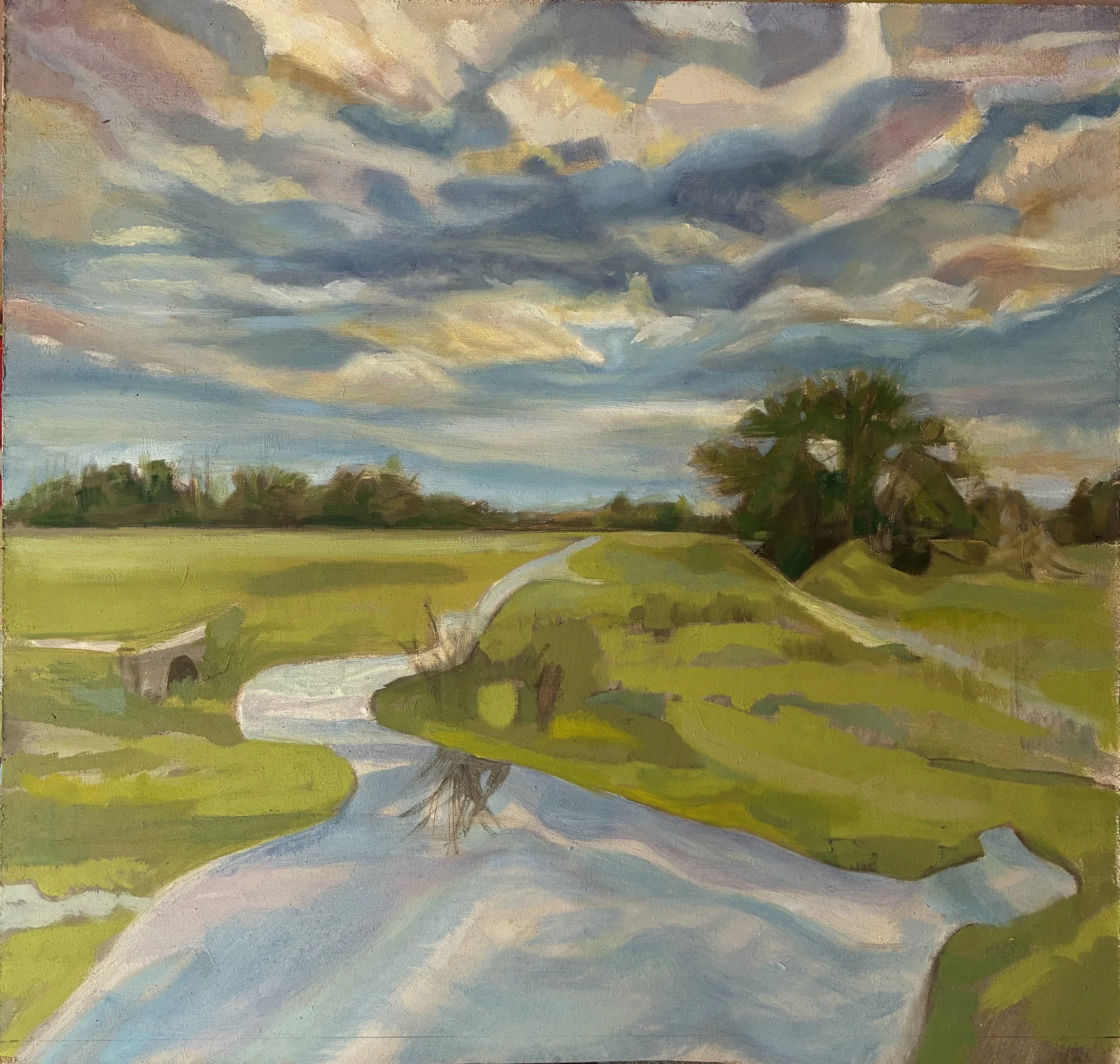 Water is an endless source of inspiration and reminds us to live in harmony with these precious meadows. Painting them inspires me to abstract these interesting shapes. It allows the possibility to flatten and reinvent the pictorial plane through the constant shifting of line, shape, and texture.