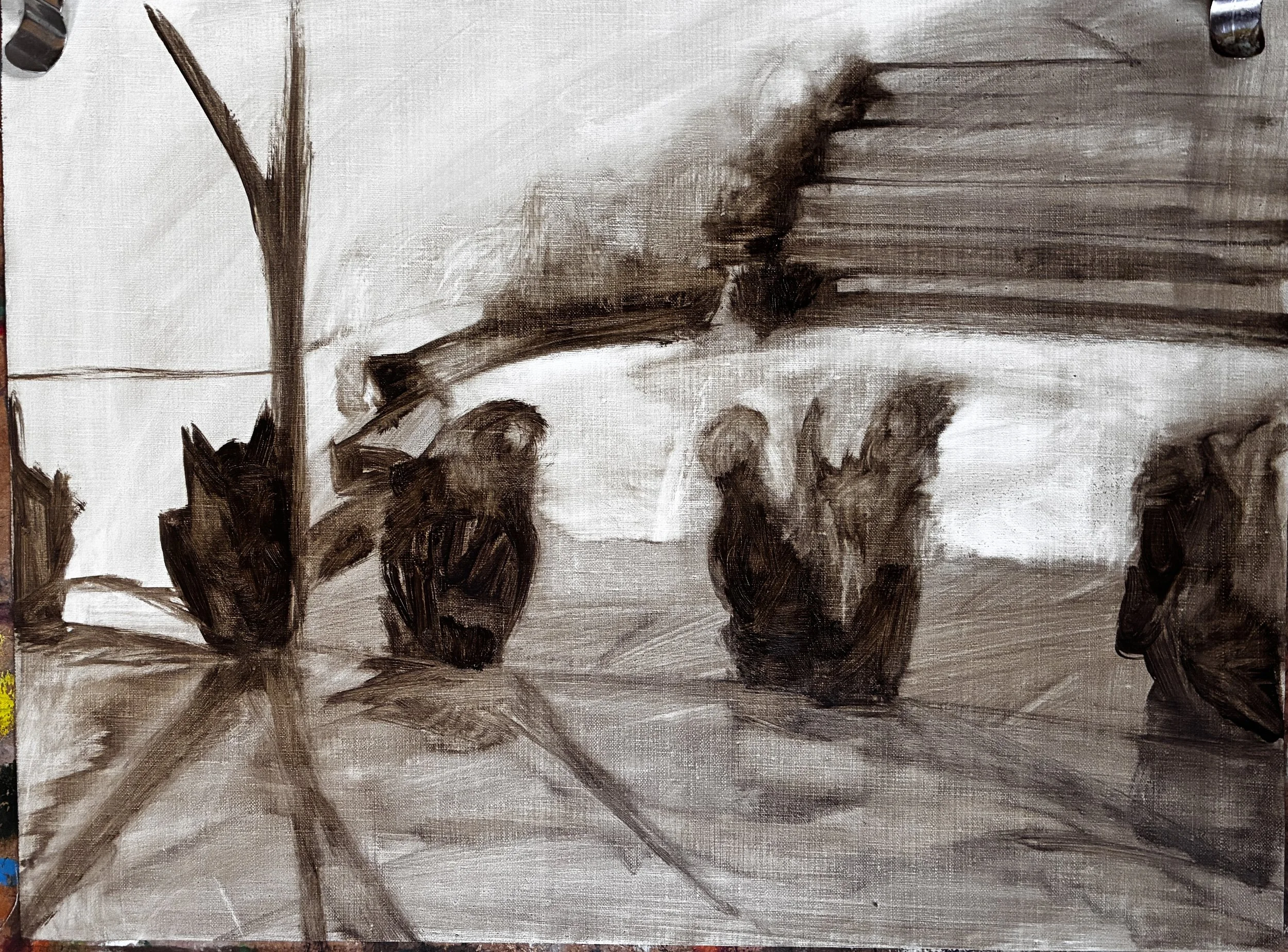 A series of landscape studies created with raw umber. The beauty of tonal studies allows the planning of composition and tonal values ,allowing me to just explore the colour as the work evolves.